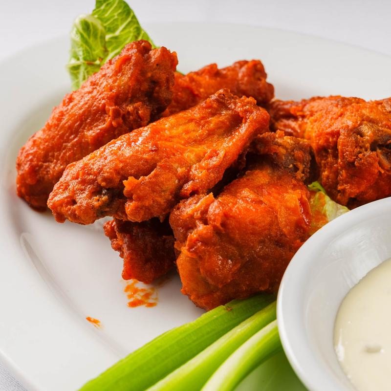 Served with BBQ or buffalo sauce, with blue cheese on the side.