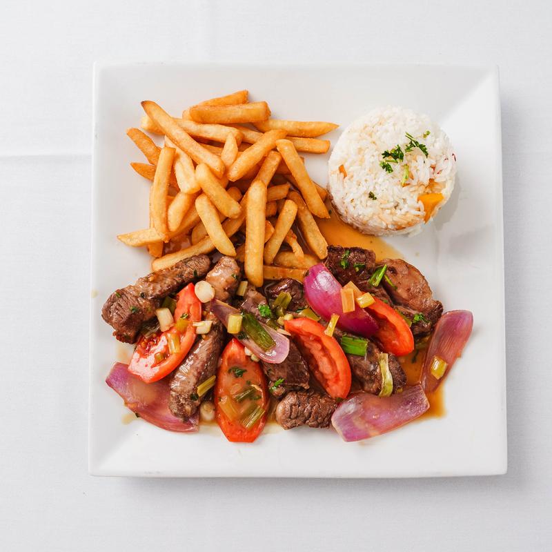 Stir-fried noodles with shrimp, tomatoes, and onions in a soy-based sauce with Peruvian spices.