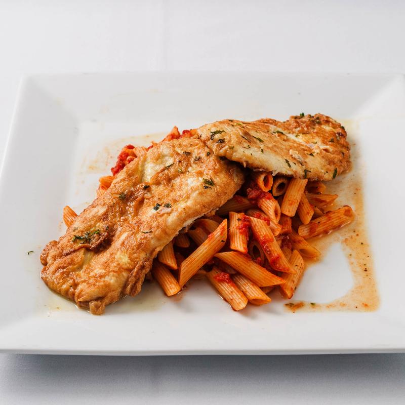 Breaded chicken cutlet topped with mozzarella cheese and parmesan. Served with penne and marinara sauce.