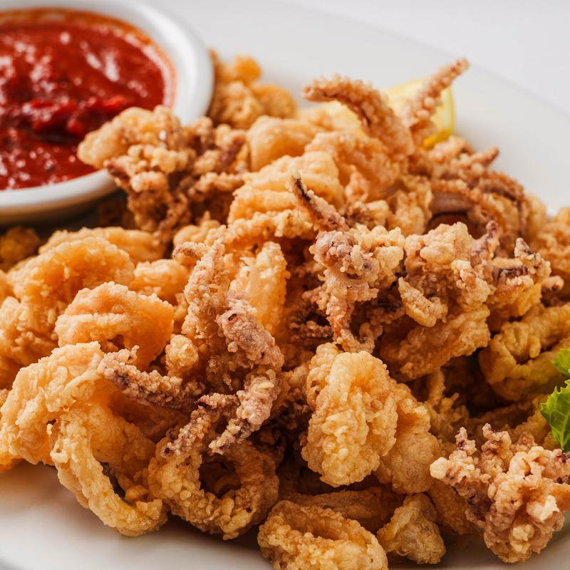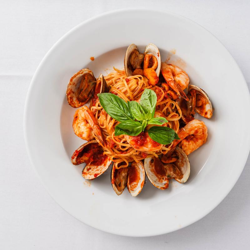 A hearty serving of linguini tossed in rich tomato sauce, topped with a savory mix of shrimp, calamari, mussels, and clams.