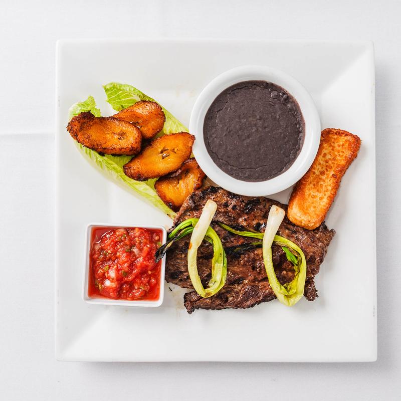 Grilled hanger steak with Guatemalan sauce. Served with white rice, creamy beans, fried plantains, and tortillas.