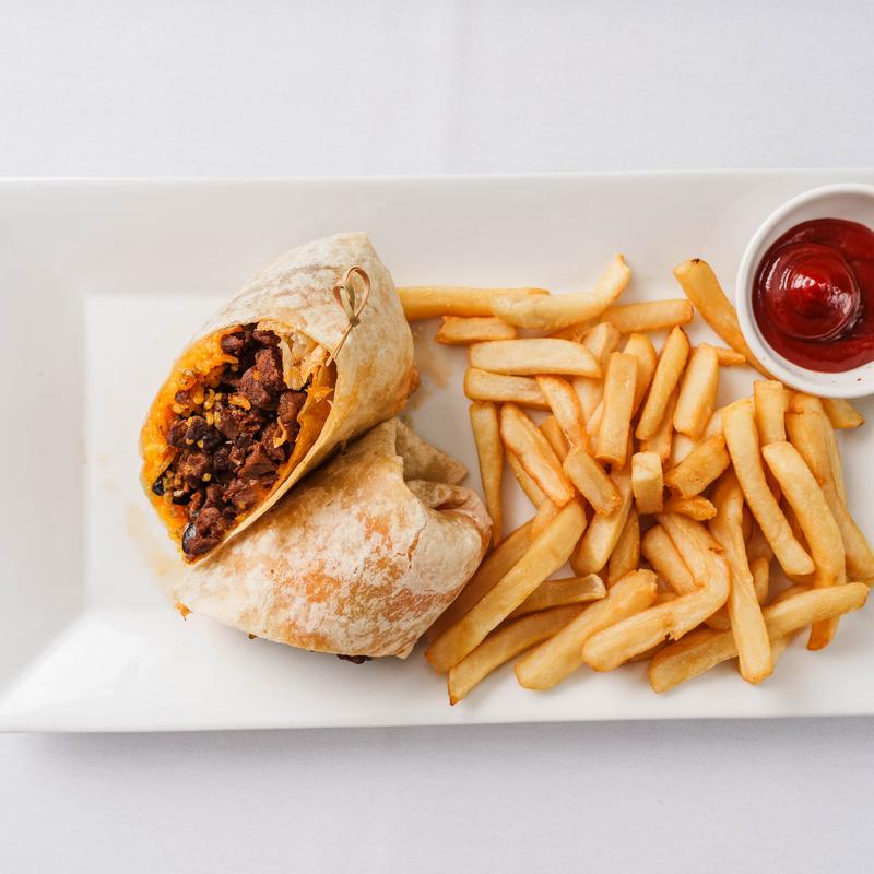 Vegetables $16.00 | Chicken $18.00 | Ground Beef $20.00 | Steak $20.00 | Shrimp $22.00 | Al Pastor $20.00 • A large flour tortilla stuffed with meat or vegetables, cheese, yellow rice, and black beans. Served with guacamole and French fries.